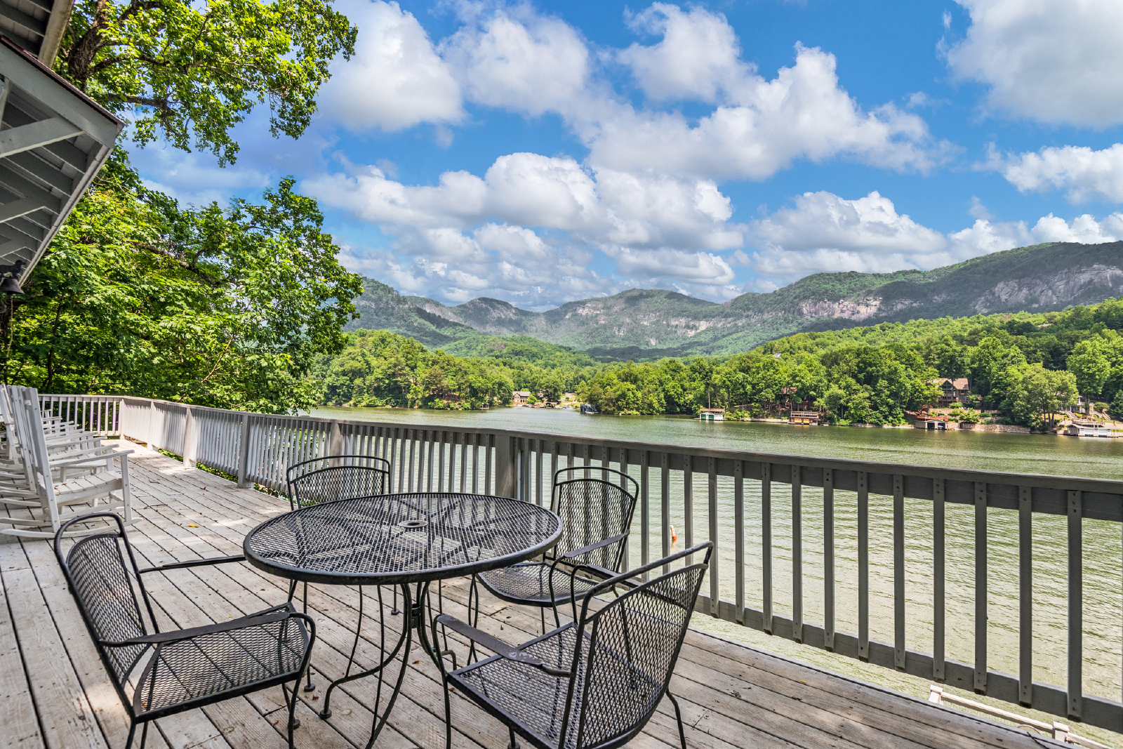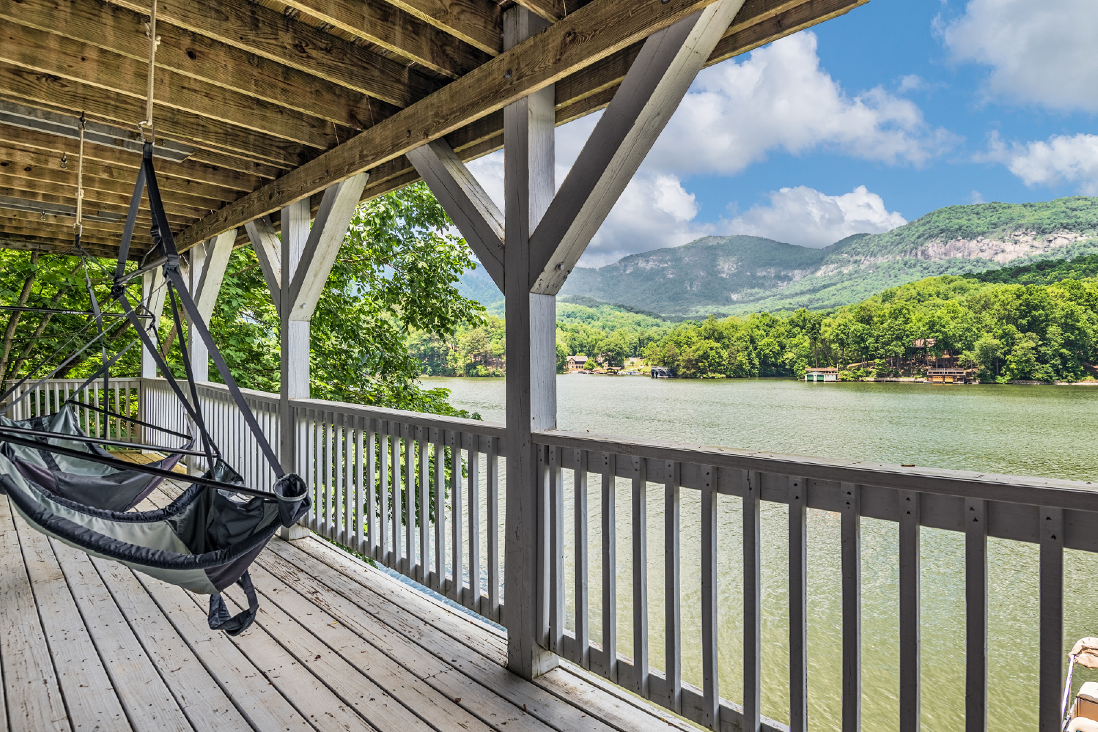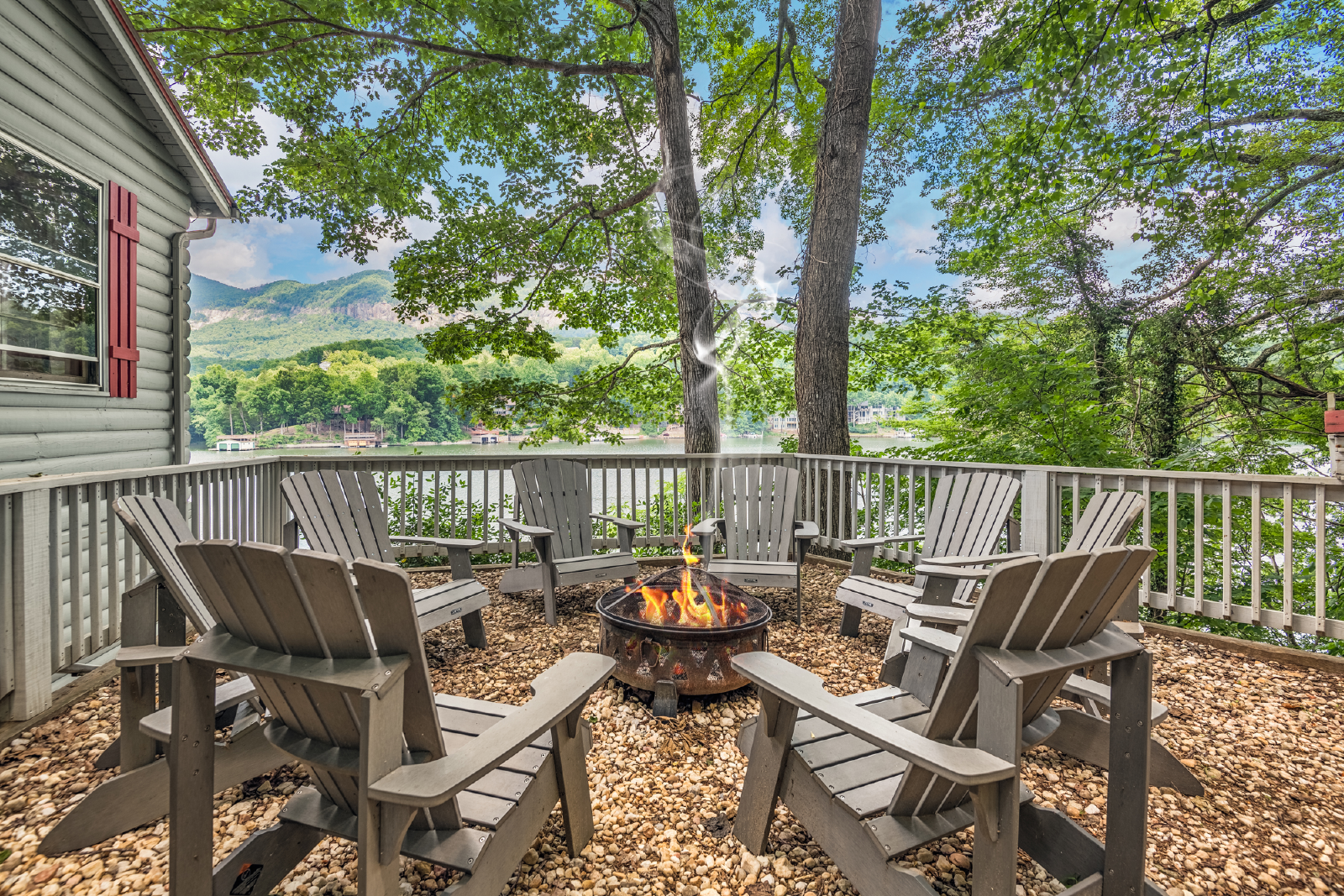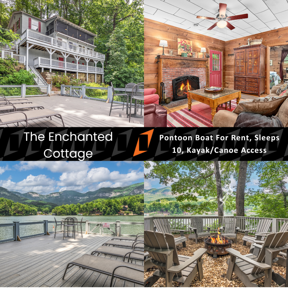 PMI Blue Ridge welcomes you to Lake Lure! Leave the world behind as you ride the funicular down to The Enchanted Cottage. The indoor living space will make you feel at home, but the real magic happens when you step onto the porch and greet the beautiful Lake Lure! This classic lakefront house features three porches, a fire pit, dock, and pontoon boat available to rent. We have a great view, overlooking the mountains, Rumbling Bald Ridge across the lake, and the spots of some famous scenes from Dirty Dancing.