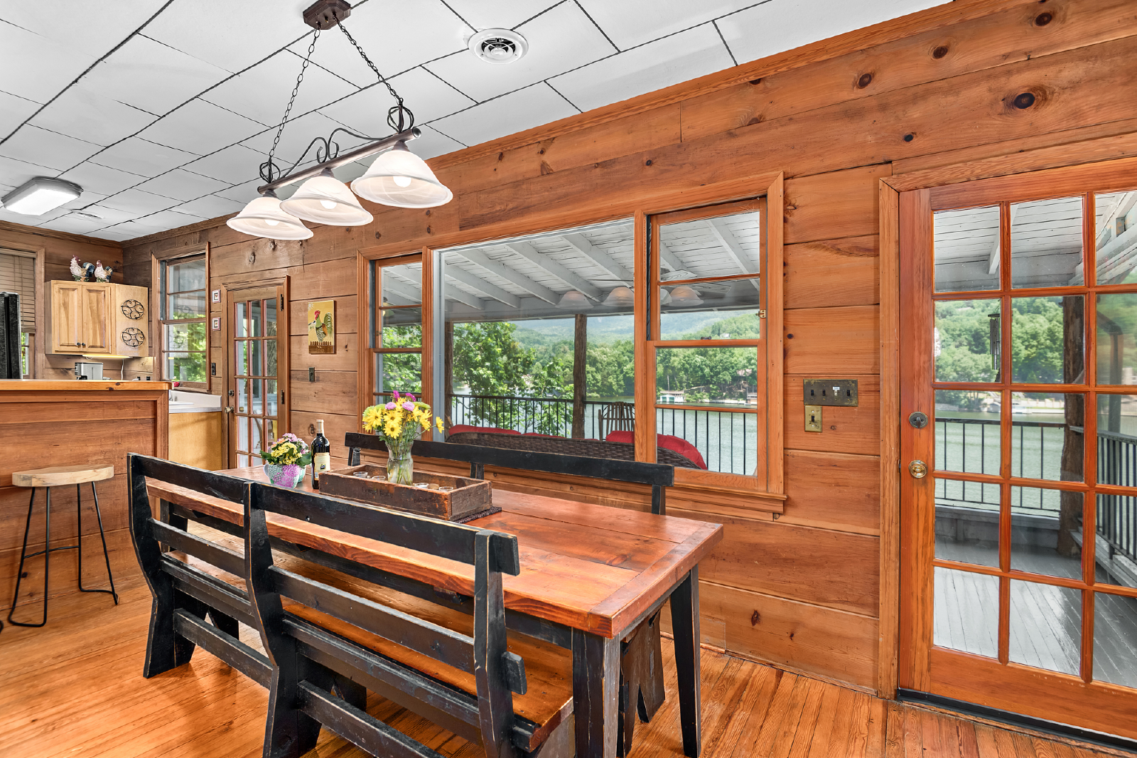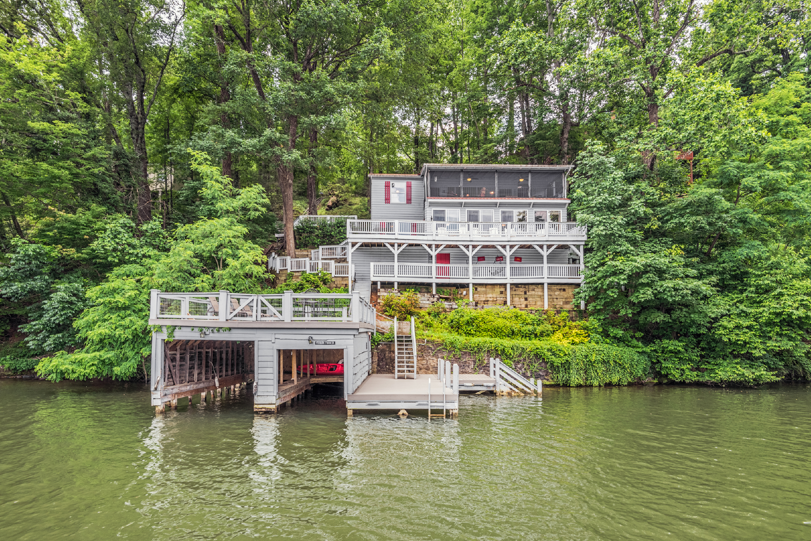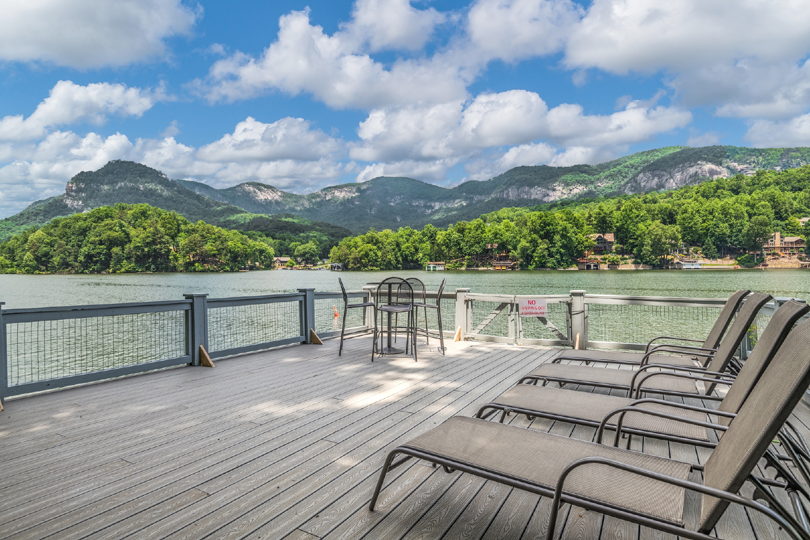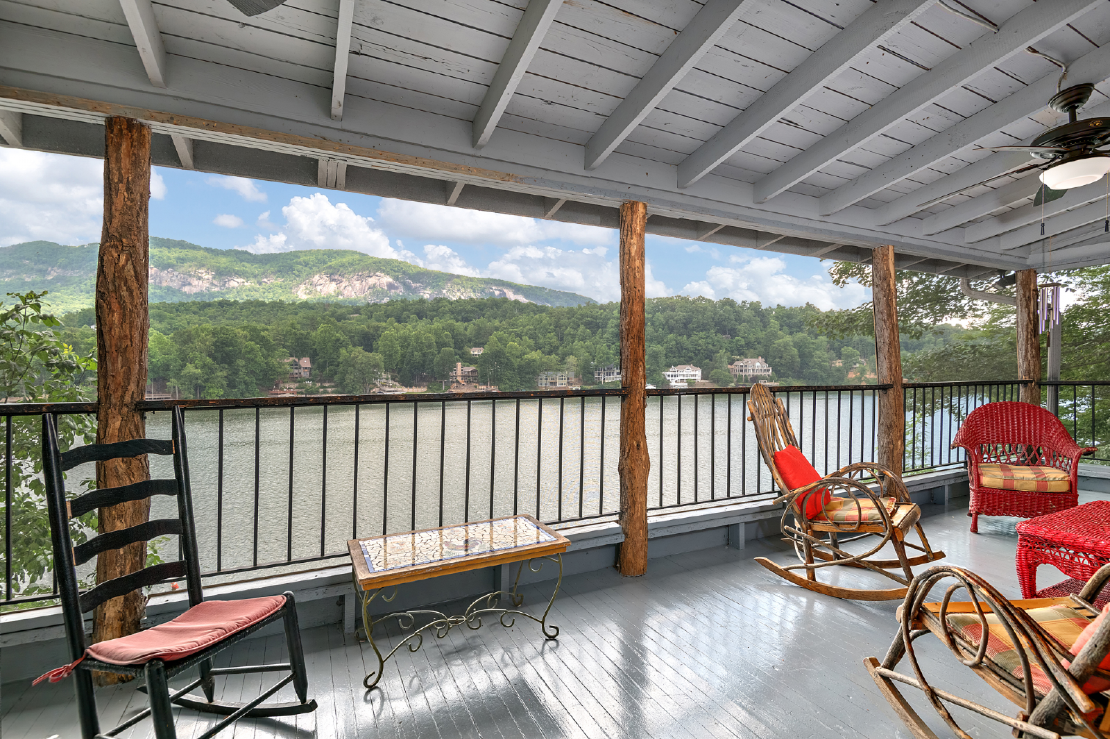 PMI Blue Ridge welcomes you to Lake Lure! Leave the world behind as you ride the funicular down to The Enchanted Cottage. The indoor living space will make you feel at home, but the real magic happens when you step onto the porch and greet the beautiful Lake Lure! This classic lakefront house features three porches, a fire pit, dock, and pontoon boat available to rent. We have a great view, overlooking the mountains, Rumbling Bald Ridge across the lake, and the spots of some famous scenes from Dirty Dancing.